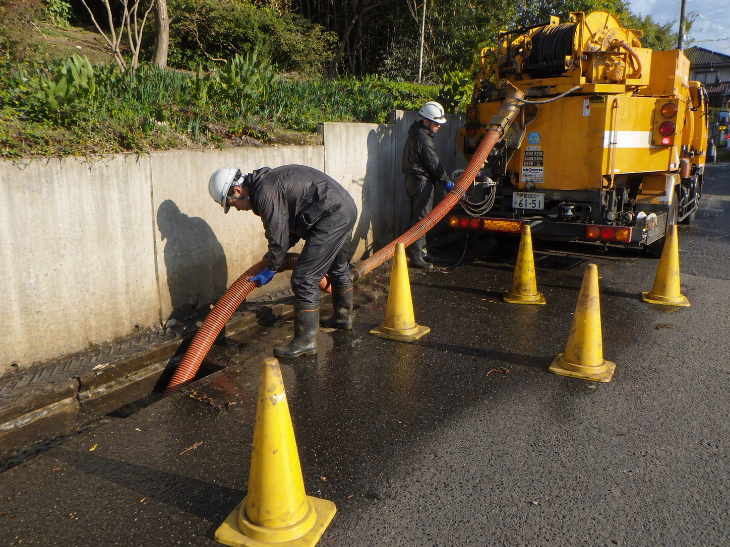 専用の吸引車両(バキュームカー)や高圧洗浄機を使って効率よく行います。